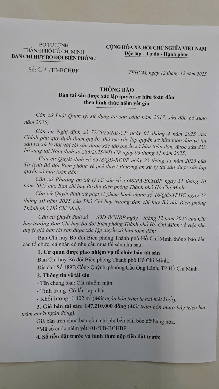 | 4. Đặc điểm của tài sản bán: | Niêm yết giá cát nhiễm mặn. Tình trạng: Có lẫn tạp chất. Khối lượng: 1.402 m3 (Một ngàn bốn trăm lẻ hai mét khối). |