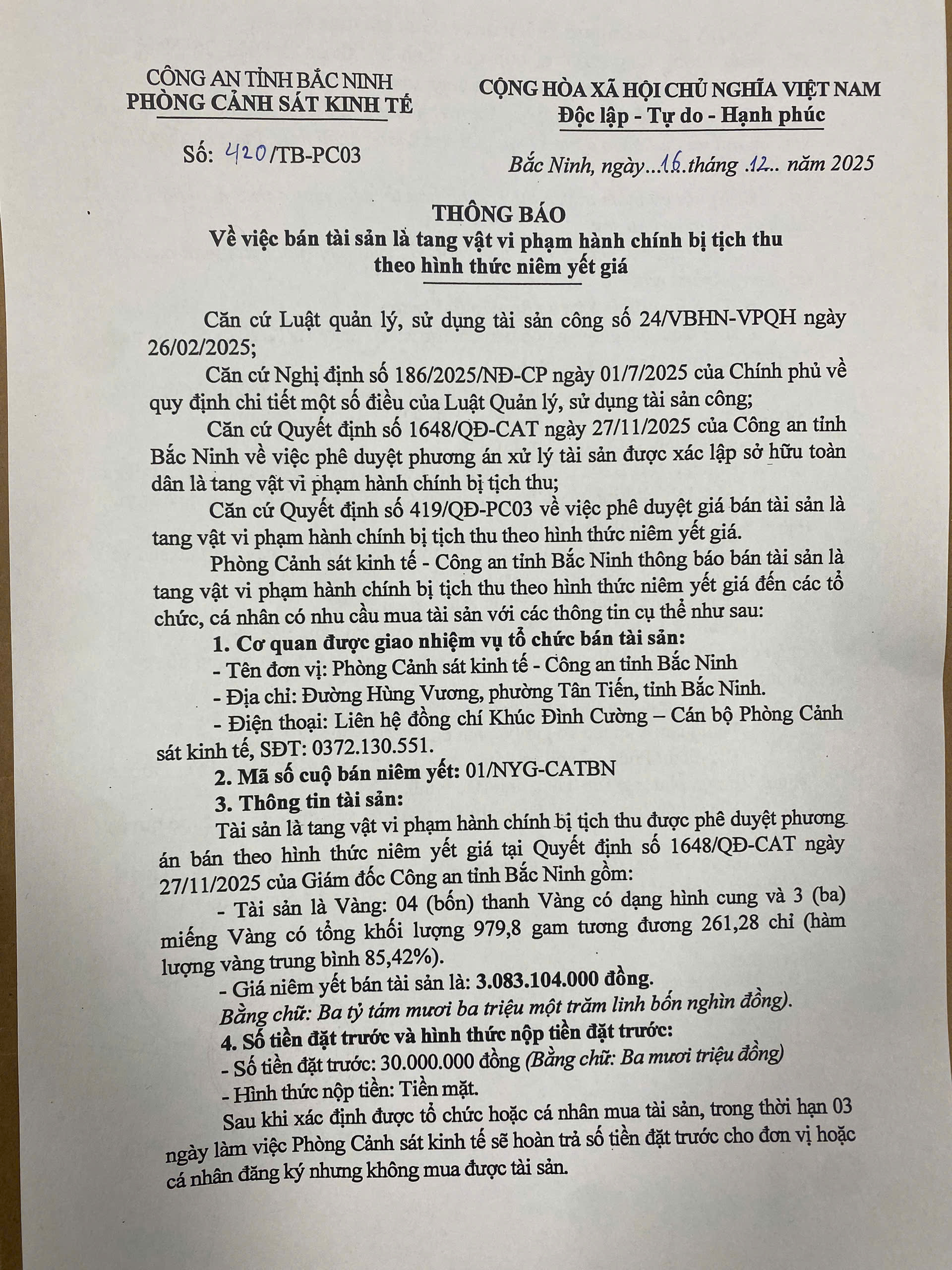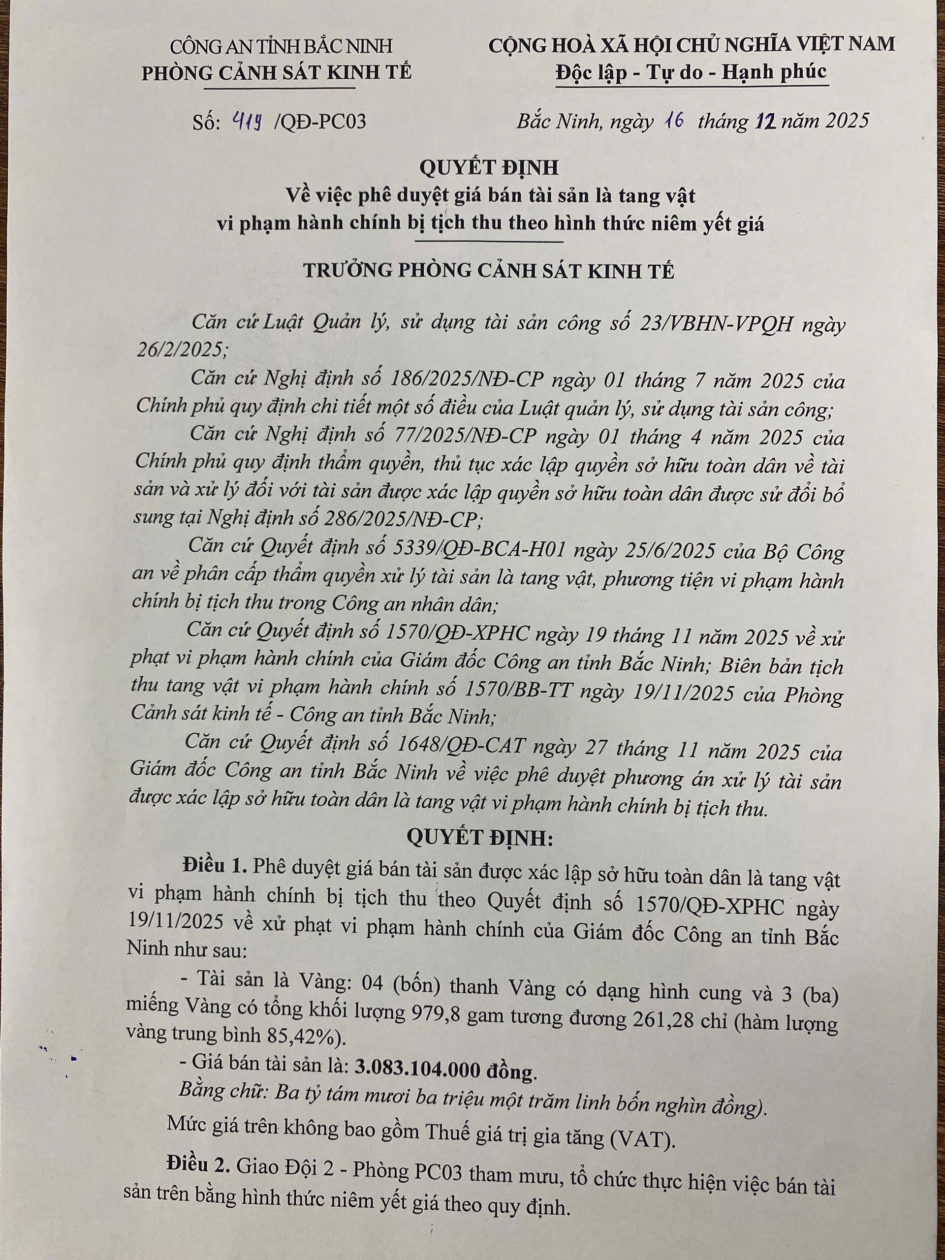 Công an tỉnh Bắc Ninh, Phường Tân Tiến, tỉnh Bắc Ninh: Niêm yết giá Niêm yết giá 04 (bốn) thanh vàng có dạng hình cung và 03 miếng vàng có tổng khối lượng 979,8 gam