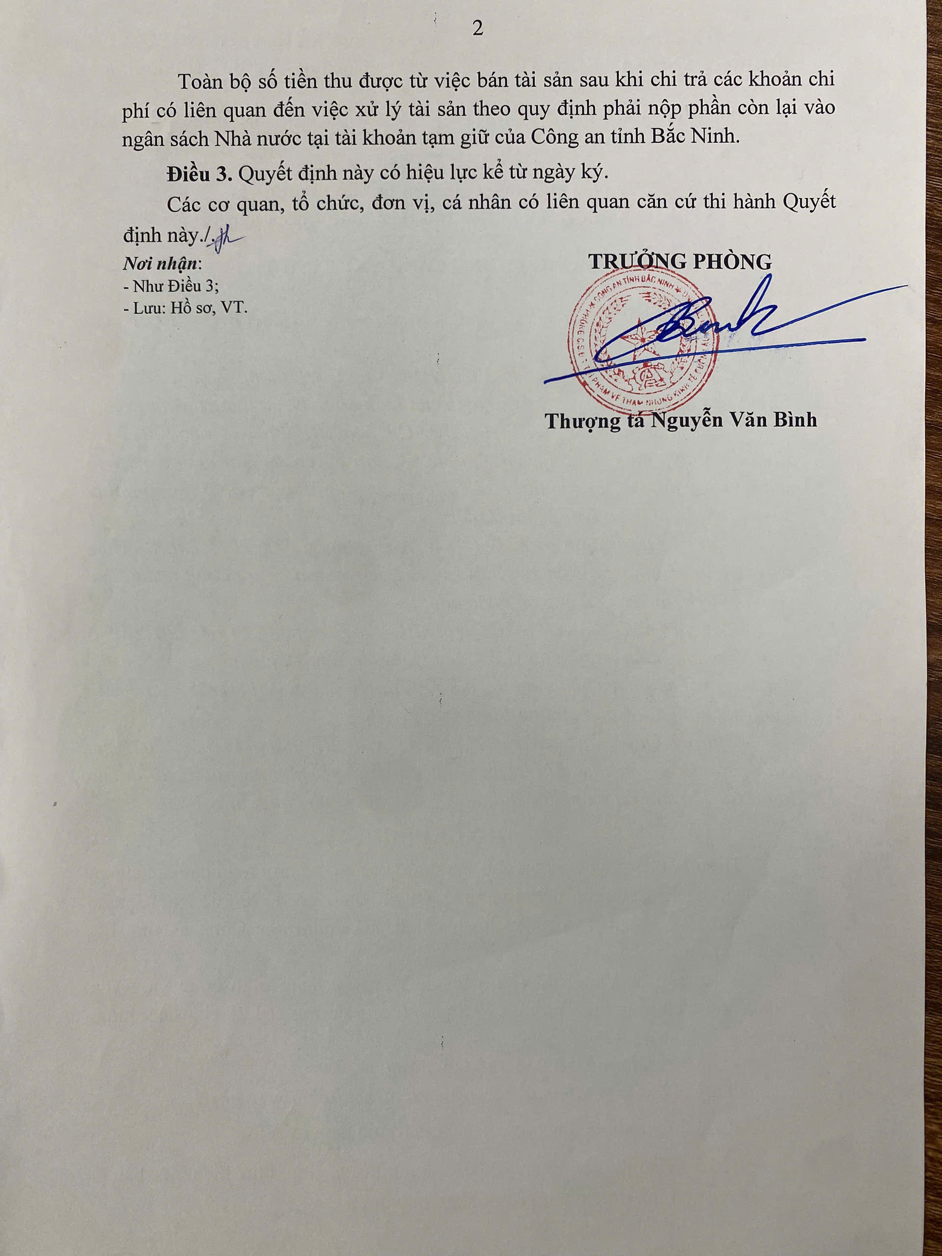 | 2. Đơn vị bán tài sản, địa chỉ đơn vị bán tài sản: | Công an tỉnh Bắc Ninh, địa chỉ: Đường Hùng Vương, Phường Tân Tiến, tỉnh Bắc Ninh |