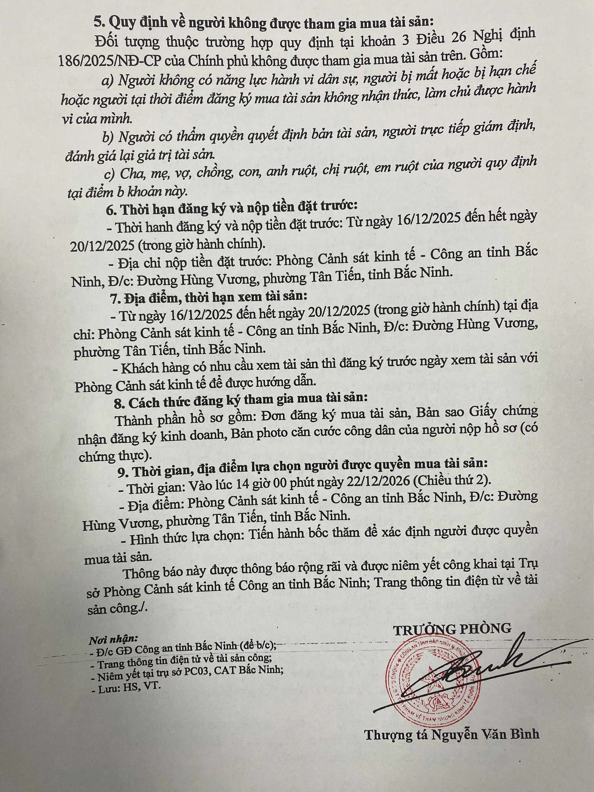 | 9. Địa điểm xem tài sản: | Phòng Cảnh sát Kinh tế Công an tỉnh Bắc Ninh, địa chỉ: Đường Hùng Vương, phường Tân Tiến, tỉnh Bắc Ninh |