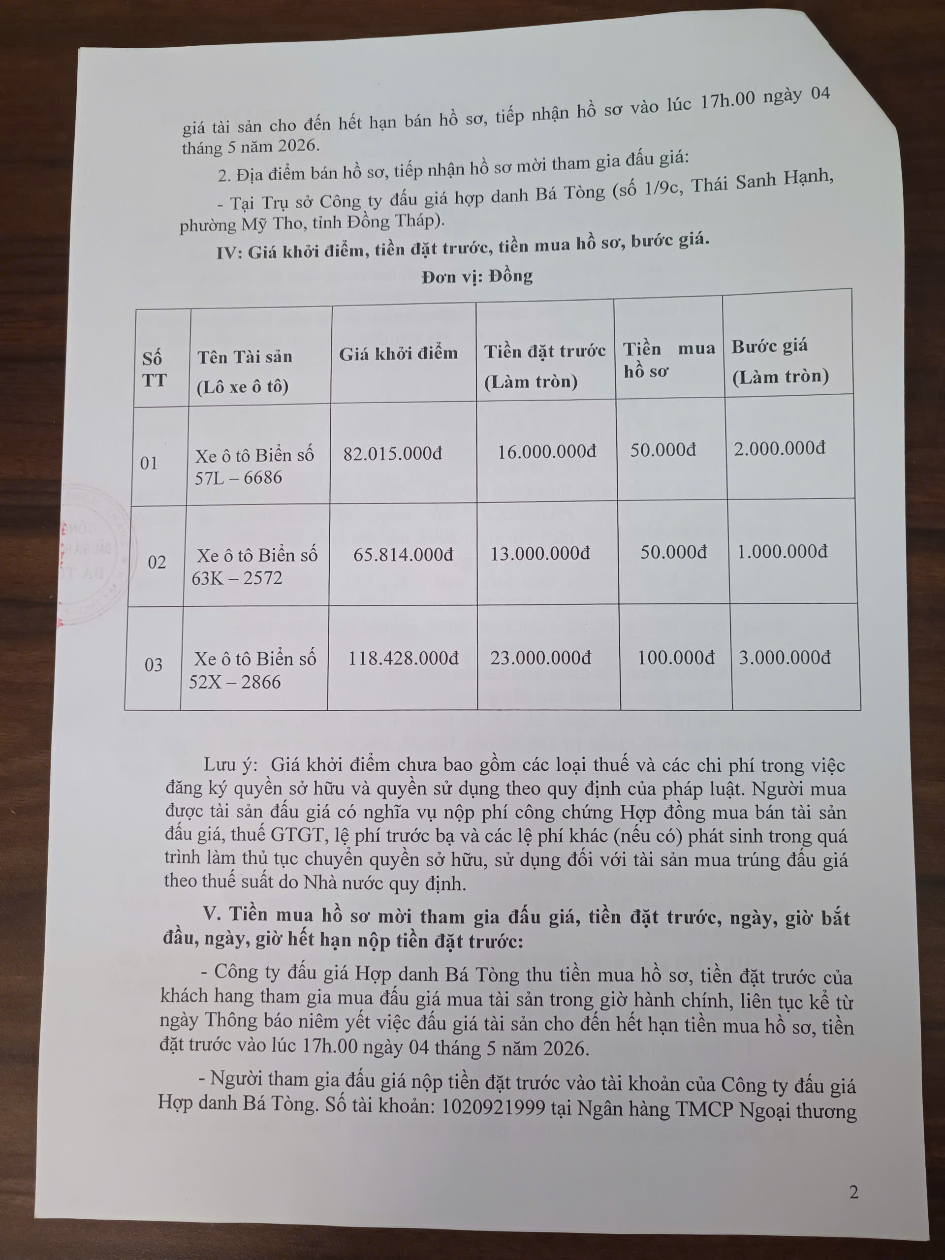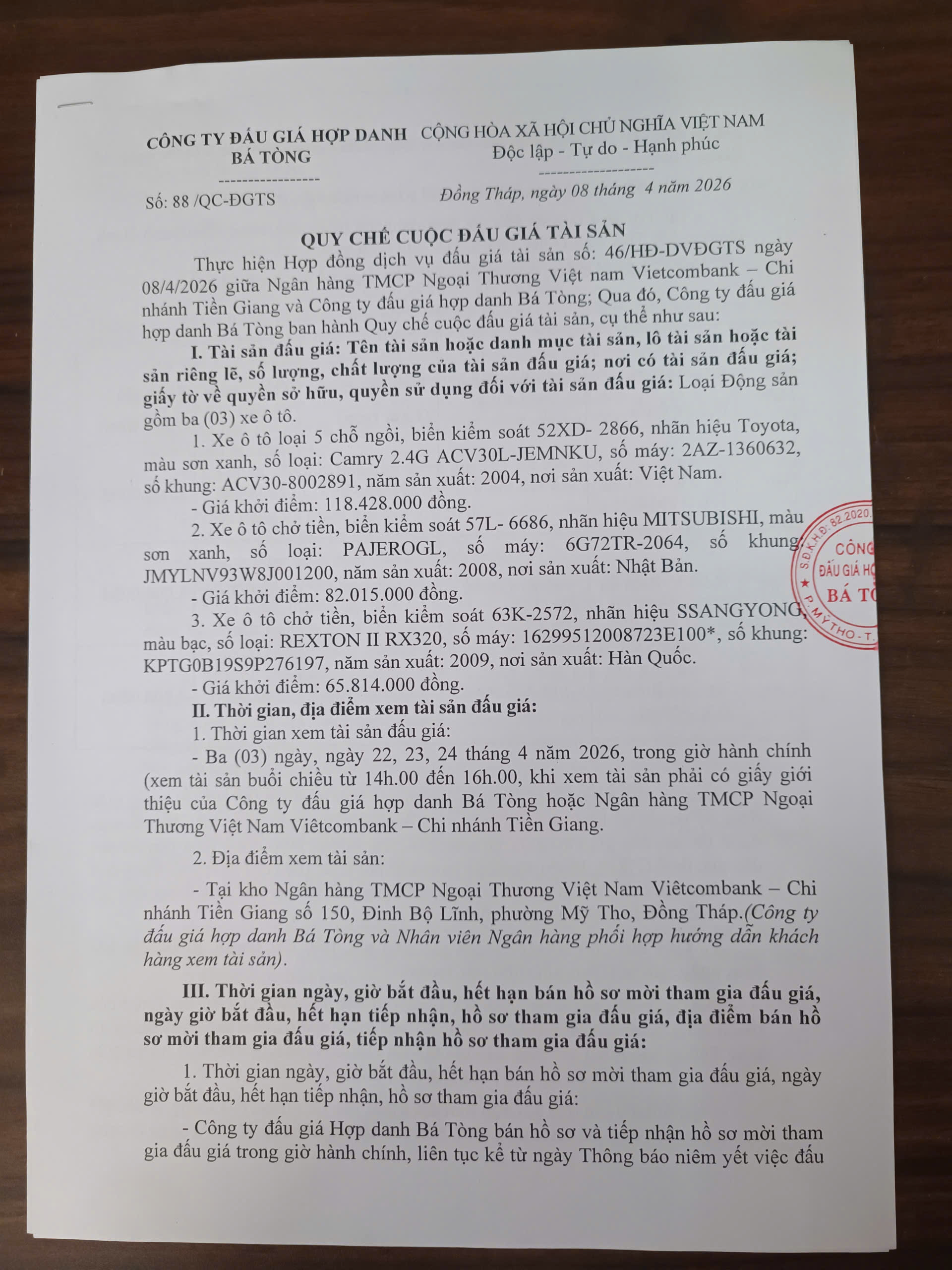 Công ty đấu giá hợp danh Bá Tòng: Đấu giá 3 xe ô tô của Ngân hàng TMCP Ngoại Thương Việt Nam Vietcombank, gồm 1 xe 5 chỗ và 2 xe chở tiền