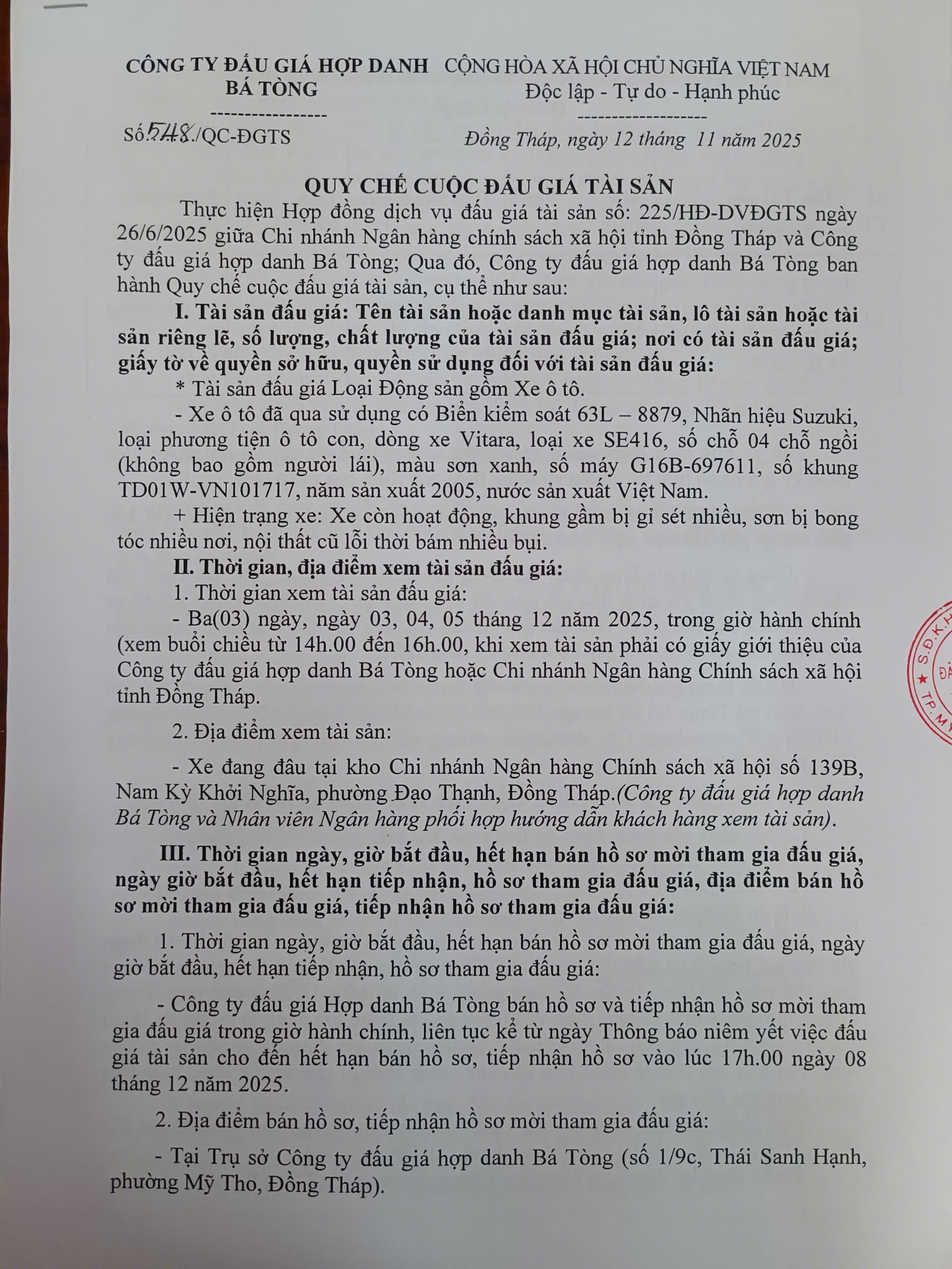 | 7. Nội dung tài sản bán: | Đấu giá xe ô tô SUZUKI VITARA, biển kiểm soát 63L-8879 |