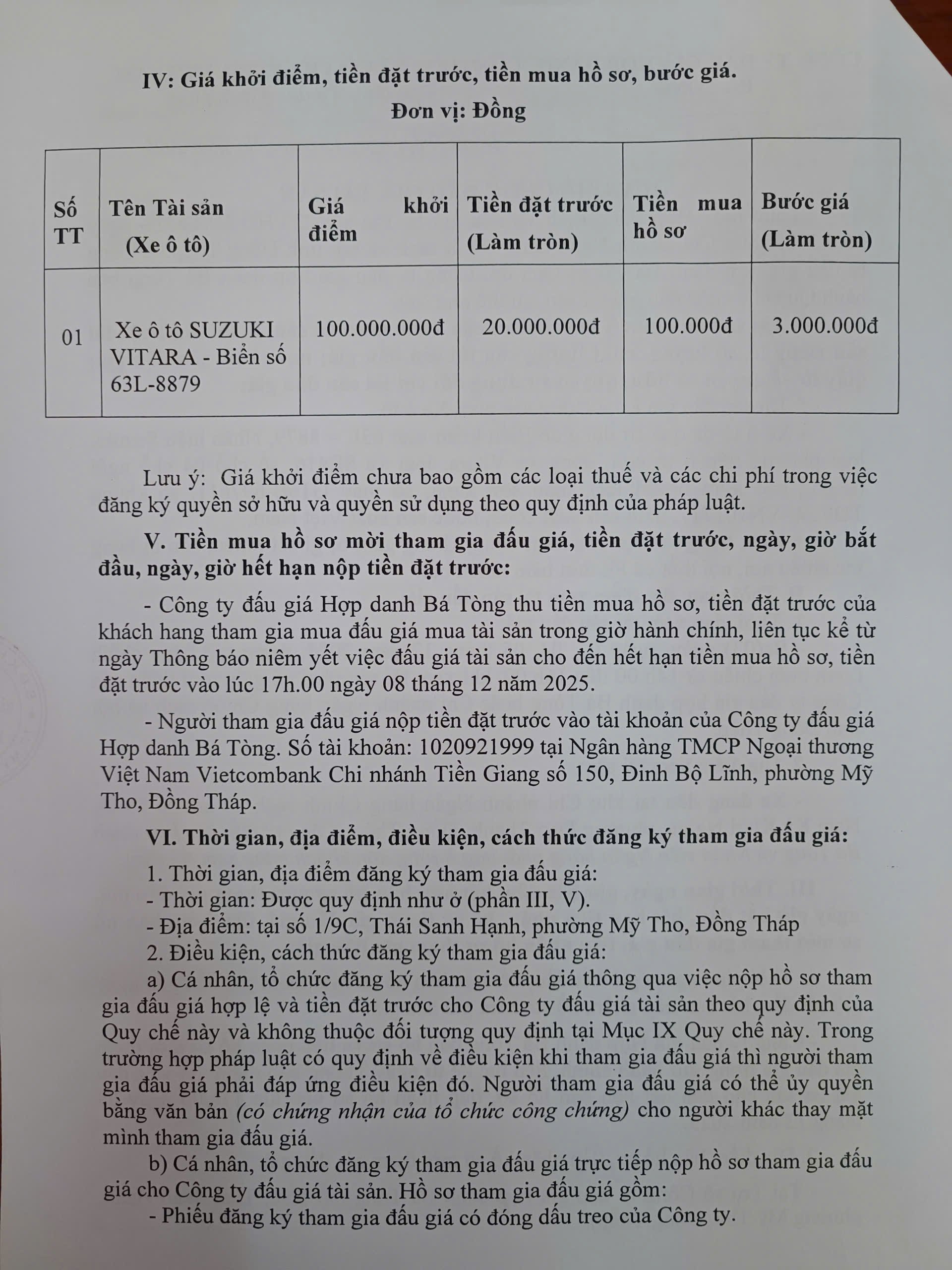 Công ty đấu giá hợp danh Bá Tòng: Đấu giá xe ô tô SUZUKI VITARA, biển kiểm soát 63L-8879