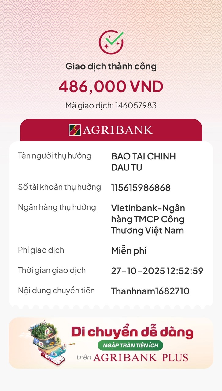 | 13. Mã chuyển khoản: | Thanhnam1682710 |