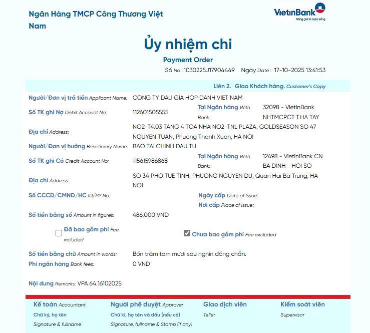 13. Mã chuyển khoản: | VPA.64.16102025 |