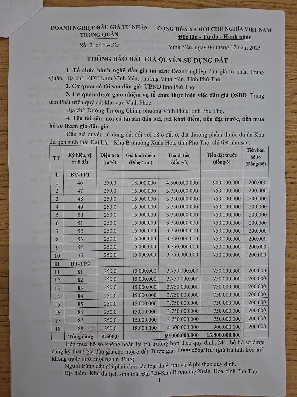 Doanh nghiệp Đấu giá tư nhân Trung Quân: Đấu giá 18 ô đất ở, đất thương phẩm thuộc dự án Khu du lịch sinh thái Đại Lải - Khu B phường Xuân Hòa, tỉnh Phú Thọ