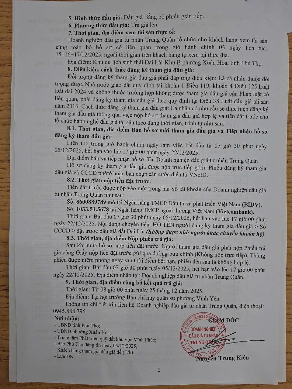 UBND tỉnh Phú Thọ (đơn vị được giao tổ chức thực hiện việc đấu giá: Trung tâm Phát triển quỹ đất khu vực Vĩnh Phúc)