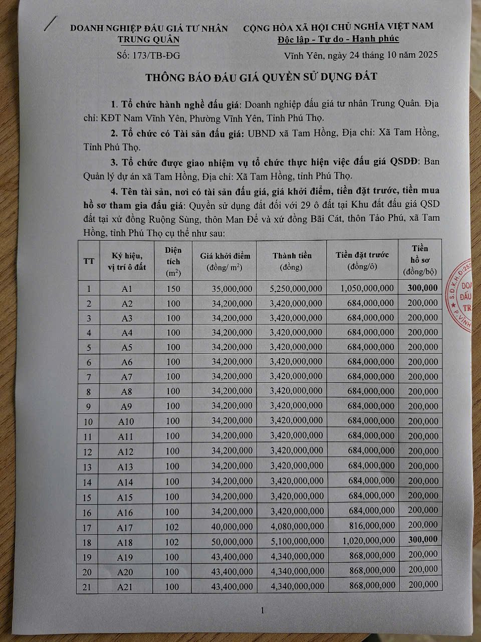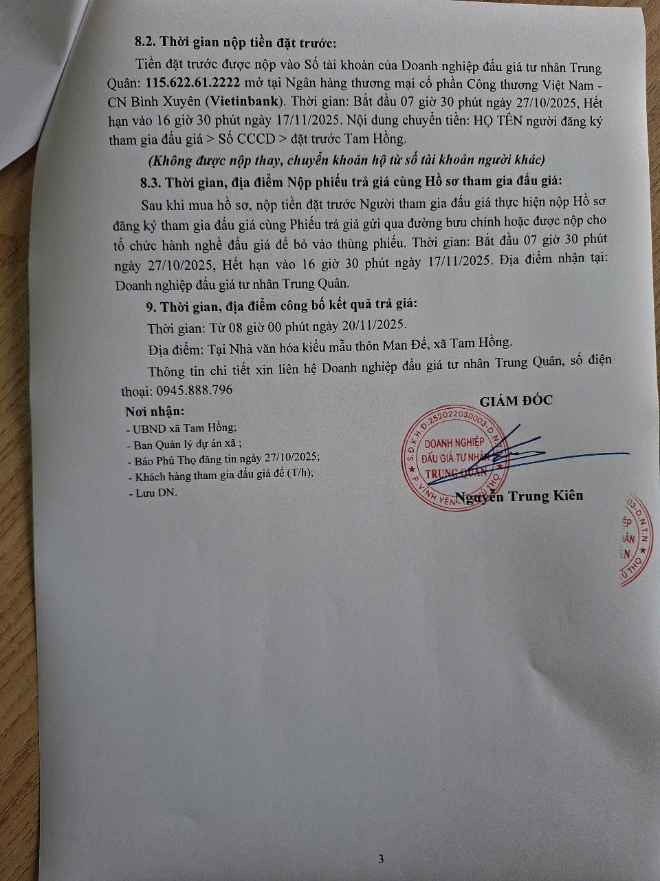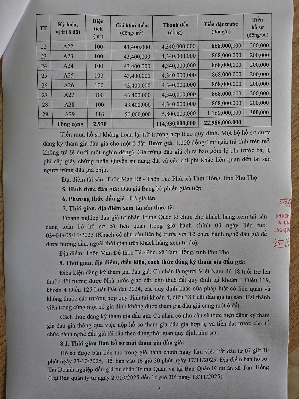 Doanh nghiệp đấu giá tư nhân Trung Quân: Đấu giá 29 ô đất tại xứ đồng Ruộng Sùng, thôn Man Để và xứ đồng Bãi Cát, thôn Tảo Phú, xã Tam Hồng, tỉnh Phú Thọ