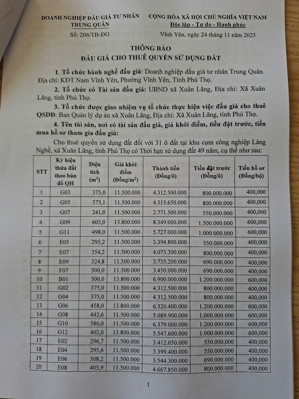 Đấu giá cho thuê quyền sử dụng đất đối với 31 ô đất tại khu cụm công nghiệp Làng Nghề, xã Xuân Lãng, tỉnh Phú Thọ có Thời hạn sử dụng đất 49 năm