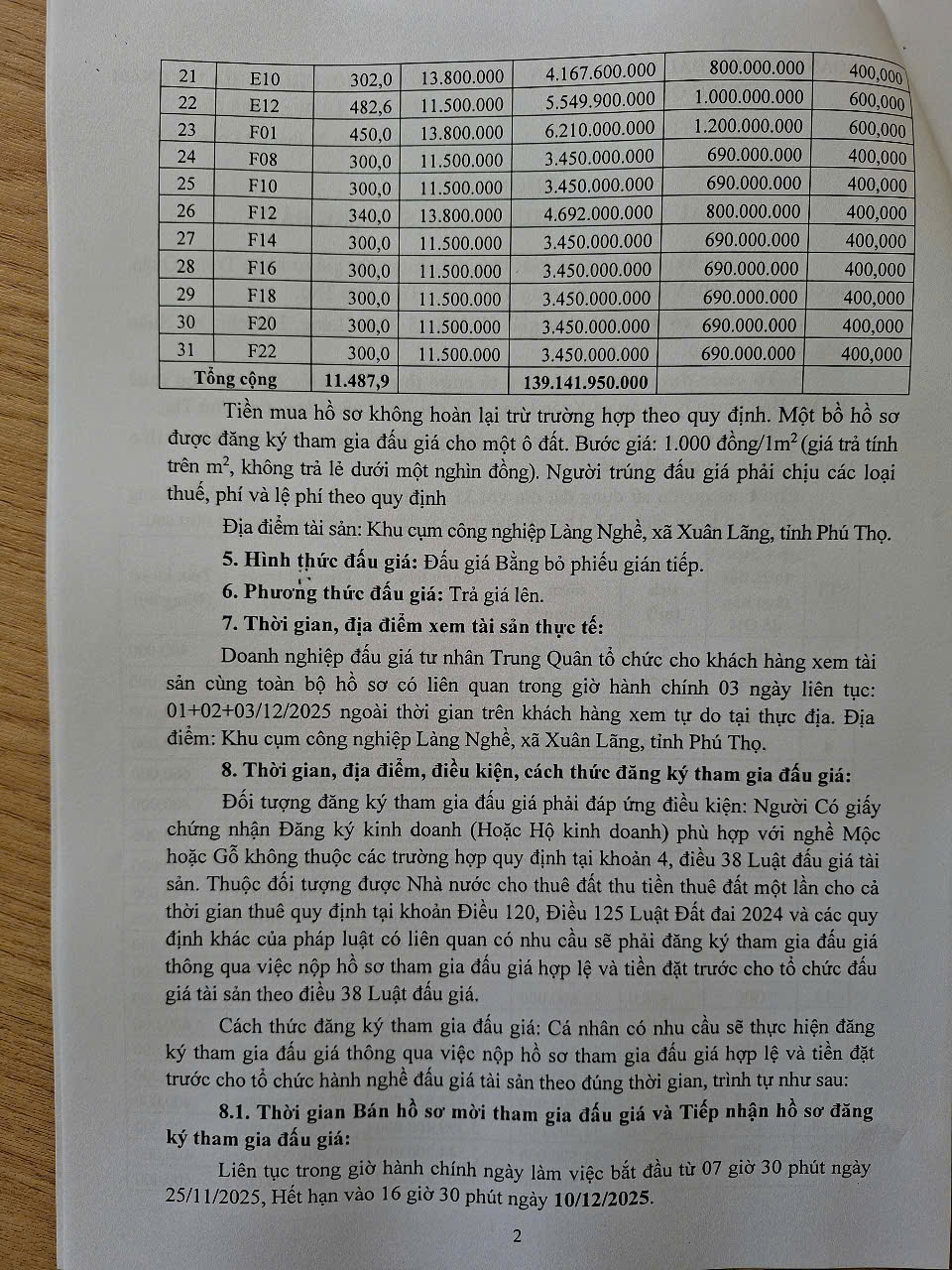 | 7. Nội dung tài sản bán: | Đấu giá cho thuê quyền sử dụng đất đối với 31 ô đất tại khu cụm công nghiệp Làng Nghề, xã Xuân Lãng, tỉnh Phú Thọ có Thời hạn sử dụng đất 49 năm |