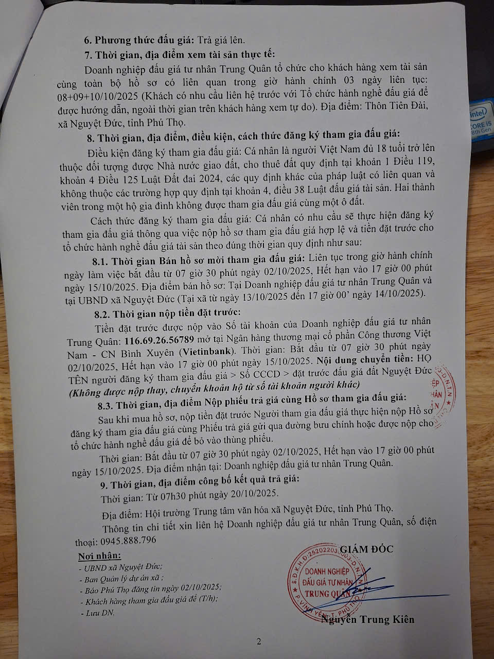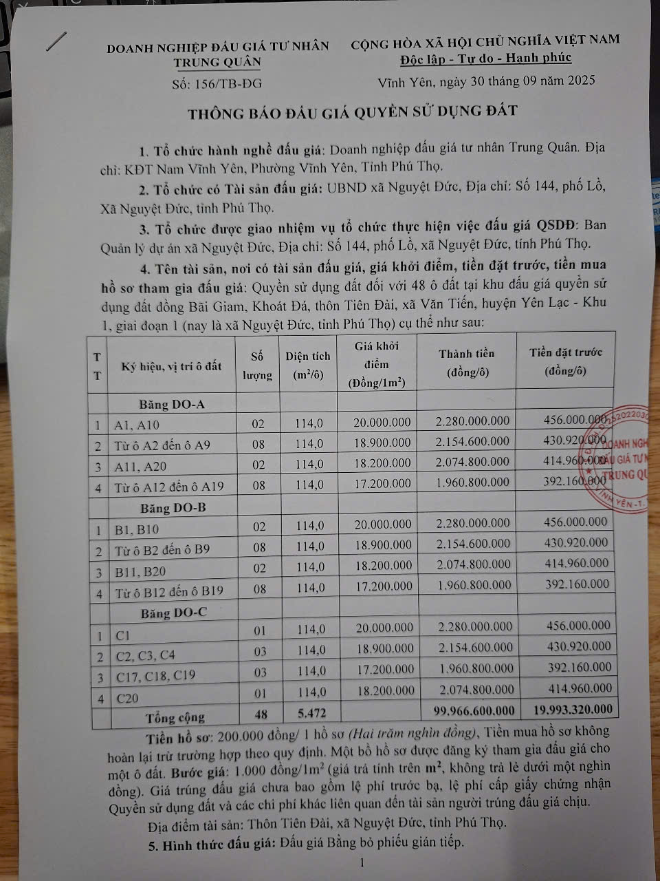 Doanh nghiệp đấu giá tư nhân Trung Quân: Đấu giá quyền sử dụng đất đối với 48 ô đất tại khu đấu giá quyền sử dụng đất xã Nguyệt Đức, tỉnh Phú Thọ
