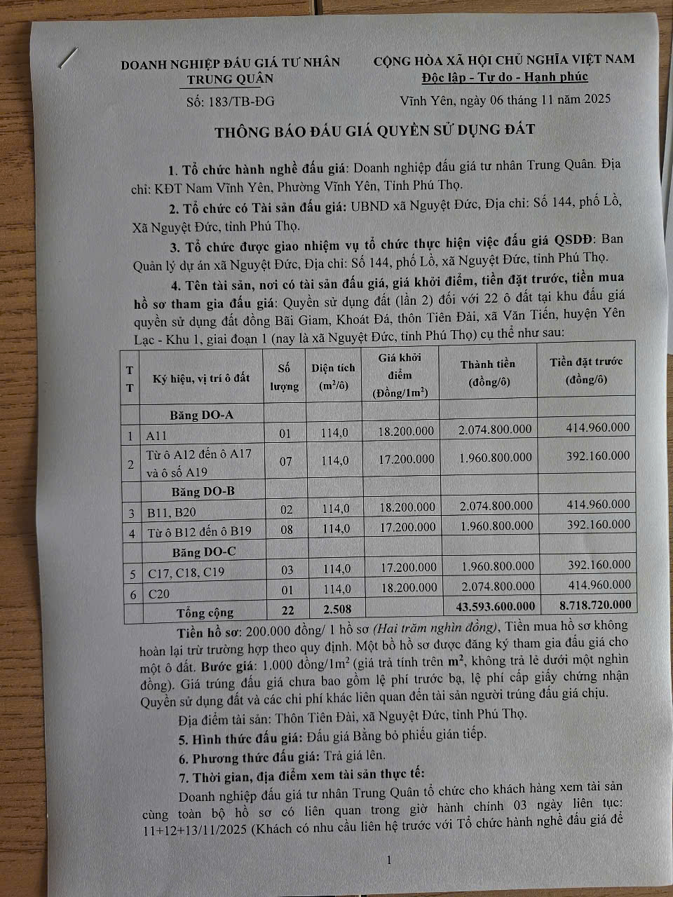 Đấu giá quyền sử dụng đất (lần 2) đối với 22 ô đất tại khu đấu giá quyền sử dụng đất đồng Bãi Giam, Khoát Đá, thôn Tiên Đài, xã Văn Tiến, huyện Yên Lạc - Khu 1, giai đoạn 1 (nay là xã Nguyệt Đức, tỉnh Phú Thọ)