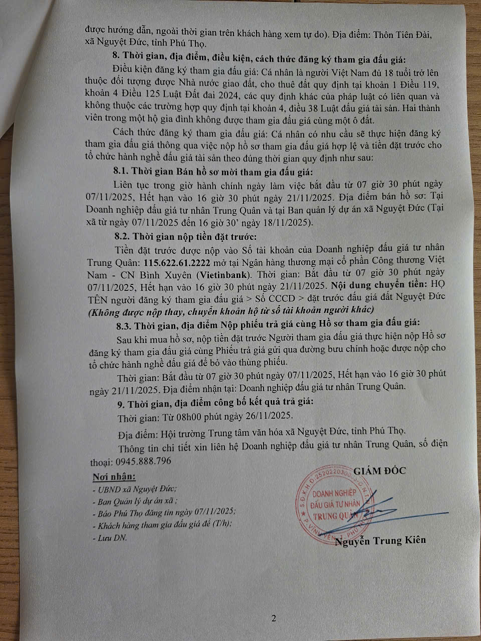 Doanh nghiệp đấu giá tư nhân Trung Quân: Đấu giá quyền sử dụng đất (lần 2) đối với 22 ô đất tại khu đấu giá quyền sử dụng đất đồng Bãi Giam, Khoát Đá, thôn Tiên Đài, xã Nguyệt Đức, tỉnh Phú Thọ