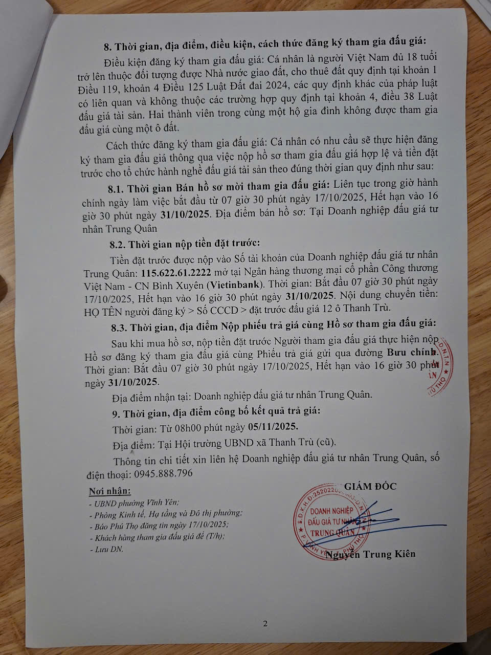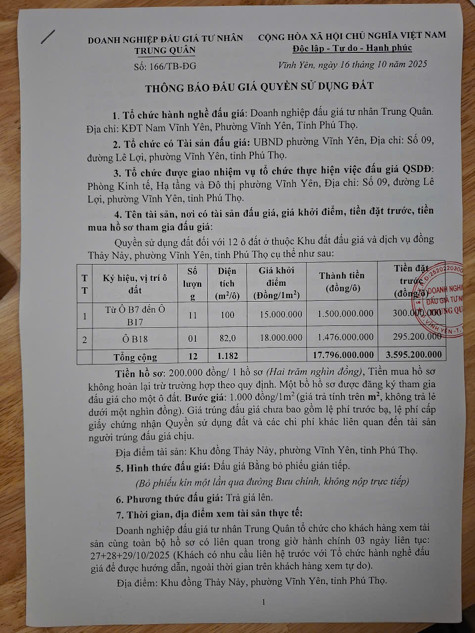 Doanh nghiệp đấu giá tư nhân Trung Quân: Thông báo đấu giá quyền sử dụng đất đối với 12 ô đất ở thuộc Khu đất đấu giá và dịch vụ đồng Thảy Nảy, phường Vĩnh Yên, tỉnh Phú Thọ