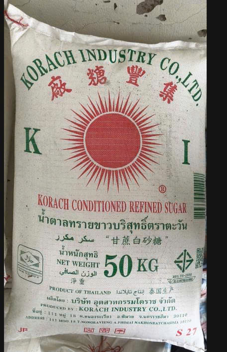 Niêm yết giá 2.399kg đường kính trắng, nhãn hiệu KORACH CONDITIONED REFINED SUGAR, đóng bao đồng nhất 50kg/bao, Thái Lan sản xuất.
