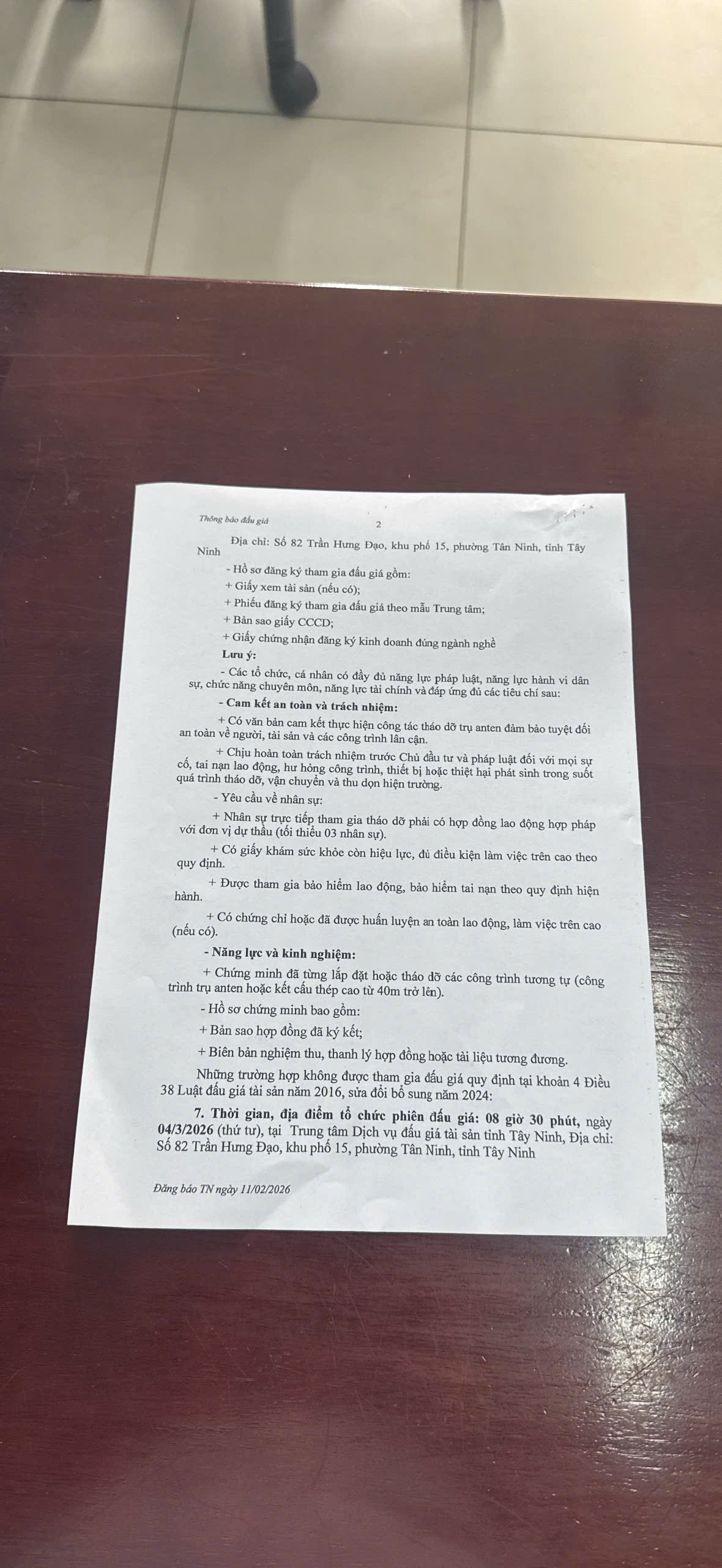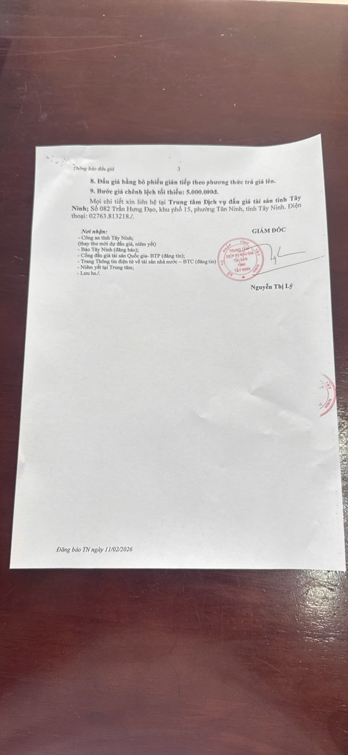 | 3. Địa chỉ đơn vị đấu giá: | số 82 Trần Hưng Đạo, Khu phố 15, phường Tân Ninh, tỉnh Tây Ninh. |