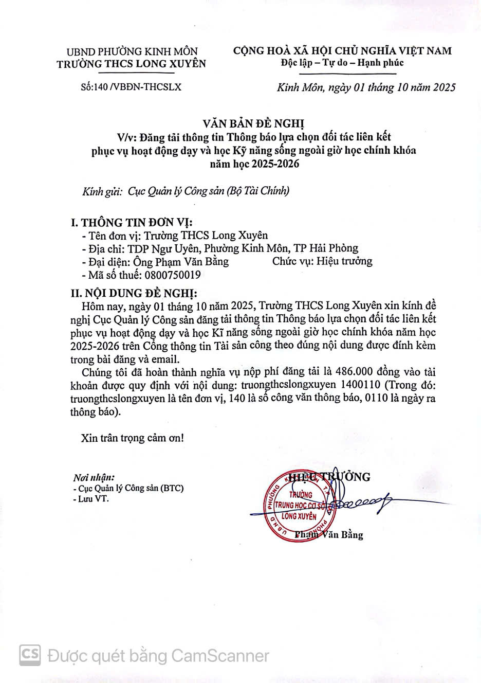 Trường THCS Long Xuyên, TP Hải Phòng: Thông báo lựa chọn đối tác liên kết phục vụ hoạt động dạy và học kĩ năng sống ngoài giờ học chính khóa